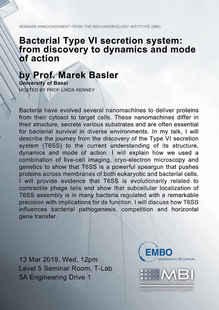 We are pleased to inform you on the seminar by Prof. Marek Basler, hosted by Prof. Linda Kenney “Bacterial Type VI secretion system: from discovery to dynamics and mode of action” on 13 Mar (Wed) @ 12pm at T-Lab Level 5 Seminar Rooms. Thank you.