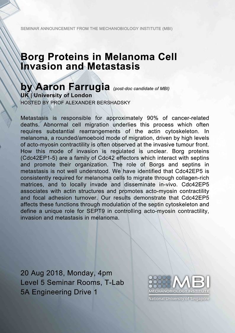 We are pleased to inform you on the seminar by Aaron Farrugia (post-doc candidate), hosted by Prof Alexander Bershadsky “Borg proteins in melanoma cell invasion and metastasis” on 20 Aug (Mon) @ 4pm at T-Lab Level 5 Seminar Rooms.