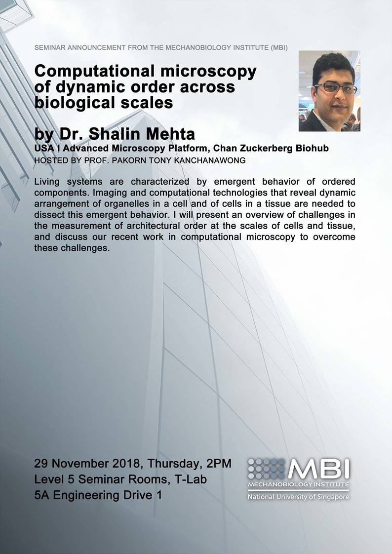 We are pleased to inform you of the seminar by Dr. Shalin Mehta, hosted by Prof. Pakorn Tony Kanchanawong, entitled Computational microscopy of dynamic order across biological scales on 29 November 2018 (Thursday) @ 2.00pm at T-Lab Level 5 Seminar Rooms.