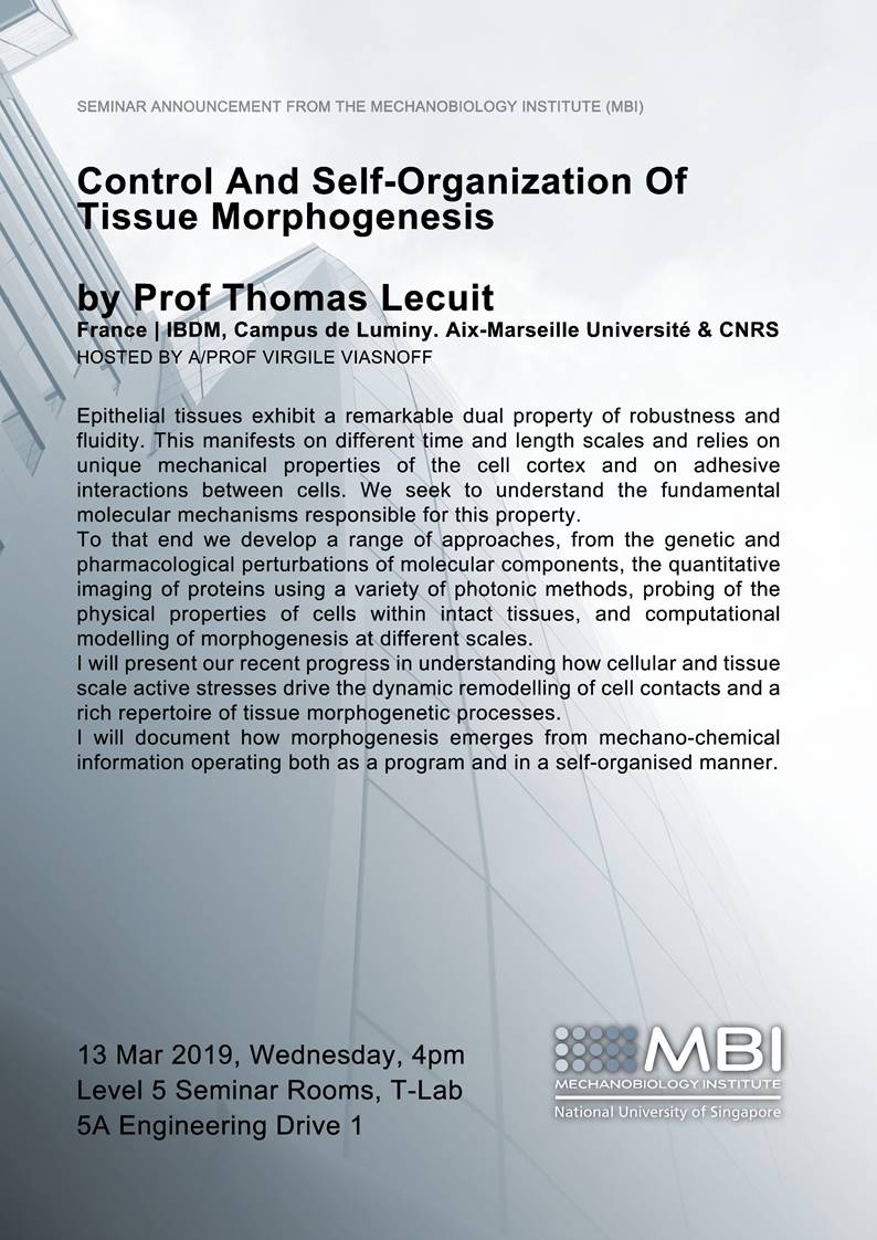 We are pleased to inform you on the seminar of Thomas Lecuit, hosted by A/Prof Virgile Viasnoff “Control And Self-Organization Of Tissue Morphogenesis” on 13 Mar (Wed) @4pm at T-Lab Level 5 Seminar Rooms.