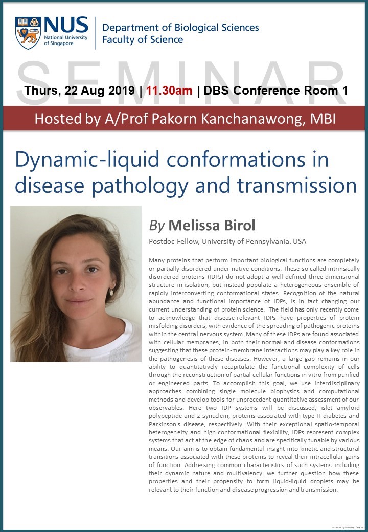We are pleased to inform you on the seminar of Dr Melissa Birol (MBI Faculty Candidate), hosted by Prof Tony Kanchanawong, “Dynamic-liquid conformations in disease pathology and transmission” on Thursday 22 Aug 2019 @ 11.30am at DBS Conference Room 1 (Block S3, Level 5). Thank you.