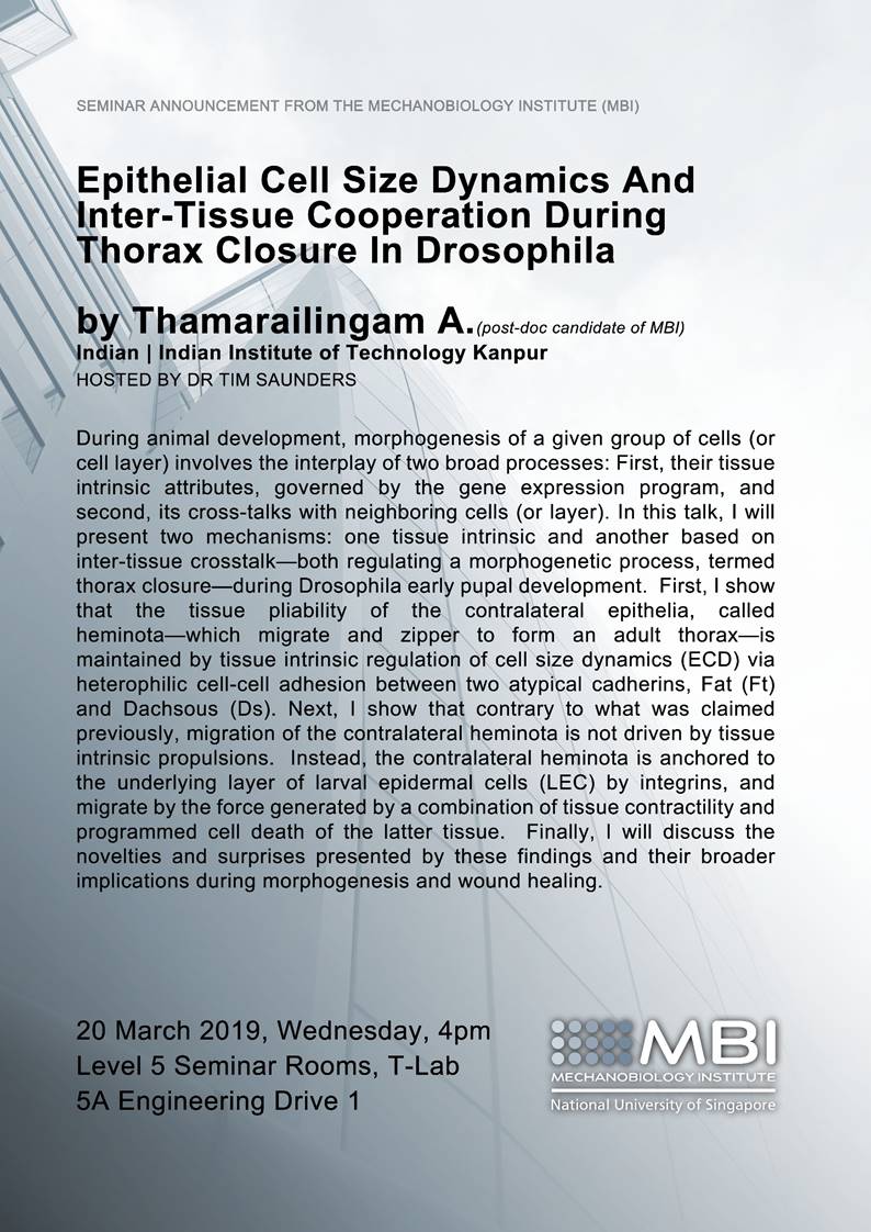 We are pleased to inform you on the seminar of MBI Seminar: Thamarailingam A. (post doc candidate), hosted by Dr Timothy Saunders “Epithelial Cell Size Dynamics And Inter-Tissue Cooperation During Thorax Closure In Drosophila” on 20 Mar (Wed) @4pm at T-Lab Level 5 Seminar Rooms. Thank you.