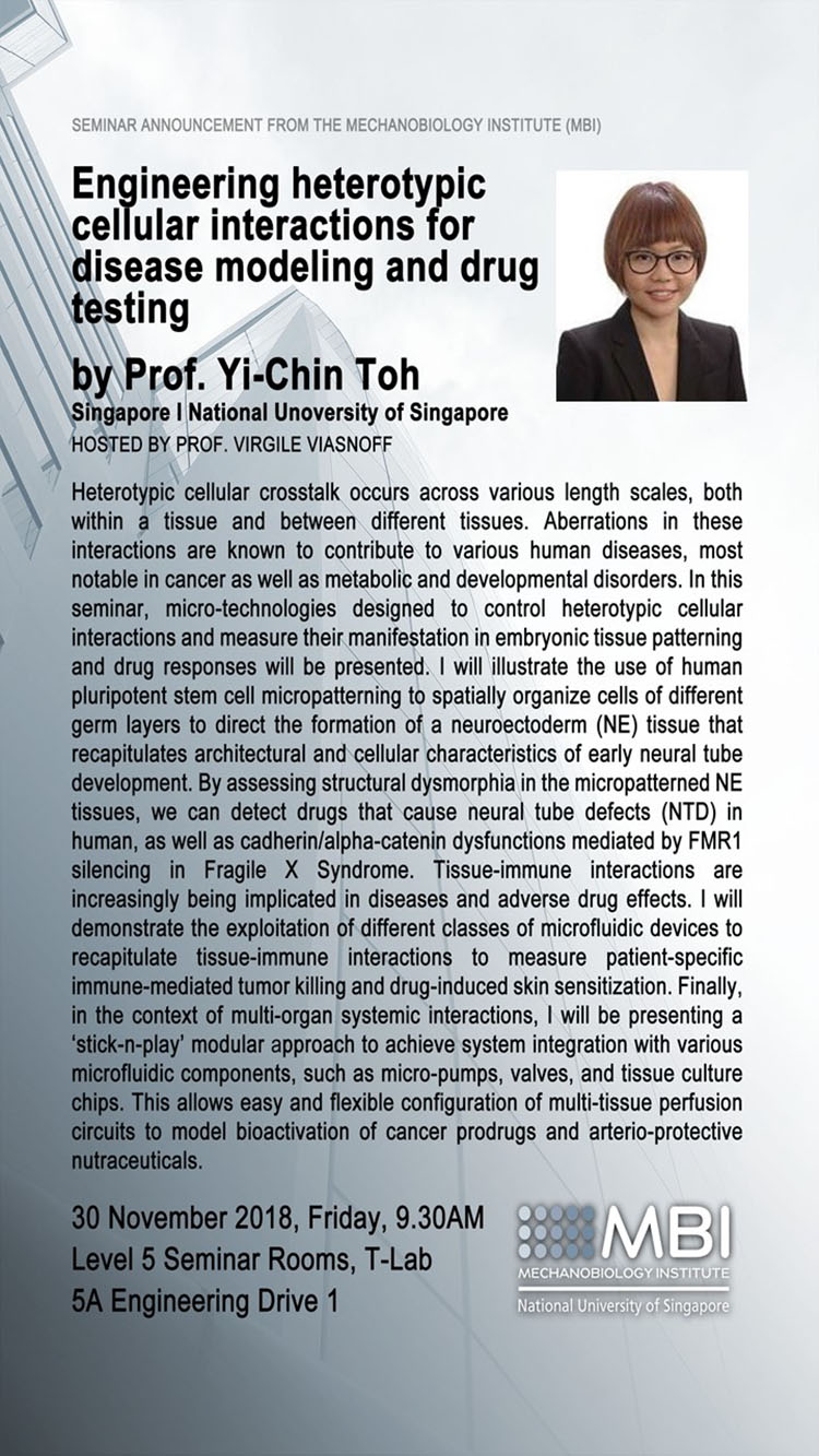 We are pleased to inform you of the seminar by Prof Yi-Chin Toh, hosted by Prof Virgile Viasnoff, entitled Engineering heterotypic cellular interactions for disease modeling and drug testing on 30 November 2018 (Friday) @9.30am at T-Lab Level 5 Seminar Rooms.