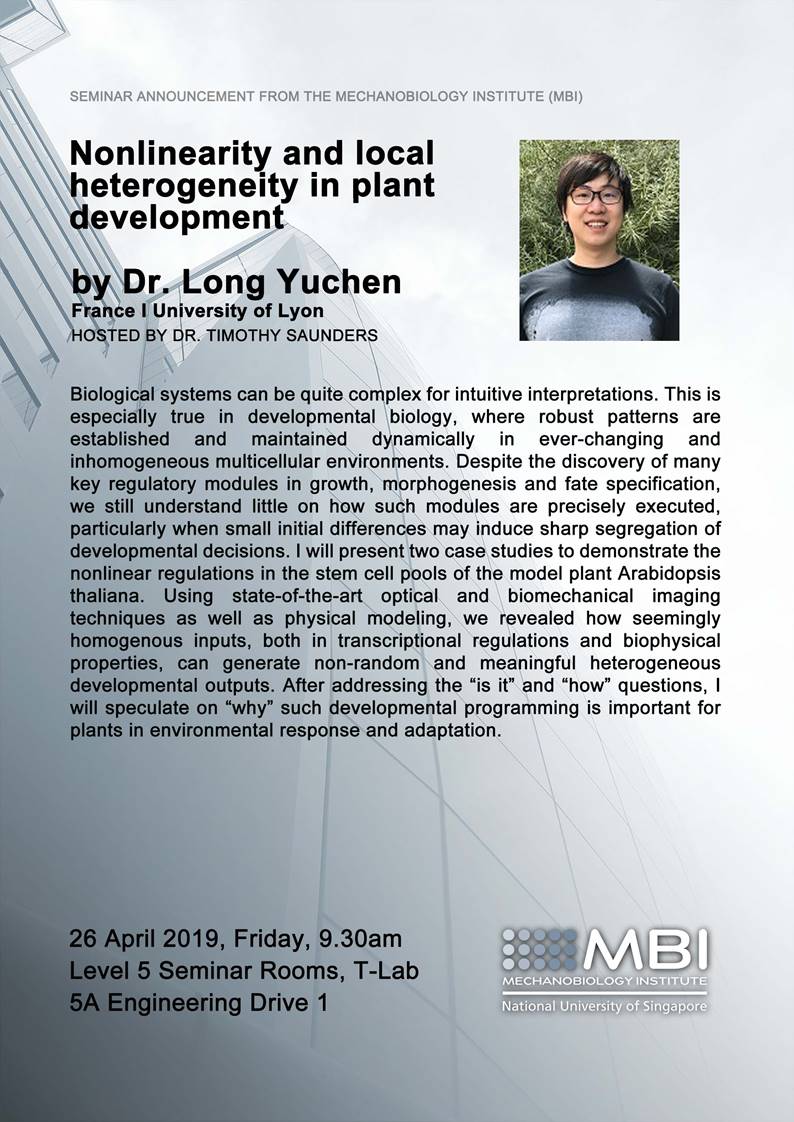 We are pleased to inform you on the seminar of Dr. Long Yuchen, hosted by Dr. Timothy Saunders “Nonlinearity and local heterogeneity in plant development” on 26 April (Friday) @9.30am at T-Lab Level 5 Seminar Rooms. Thank you.