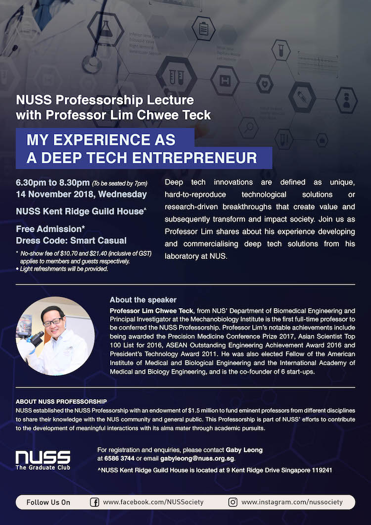 Prof Lim Chwee Teck will be giving a talk at the NUSS Professorship Lecture Series, about his experience as a deep tech entrepreneur.