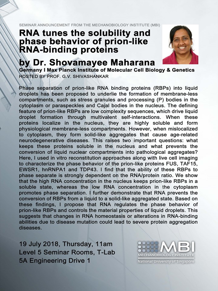 We are pleased to inform you on the seminar of Dr. Shovamayee Maharana, hosted by Prof. G.V. Shivashankar “RNA tunes the solubility and phase behavior of prion-like RNA-binding proteins” on 19 July (Thursday) @ 11am at T-Lab Level 5 Seminar Rooms.