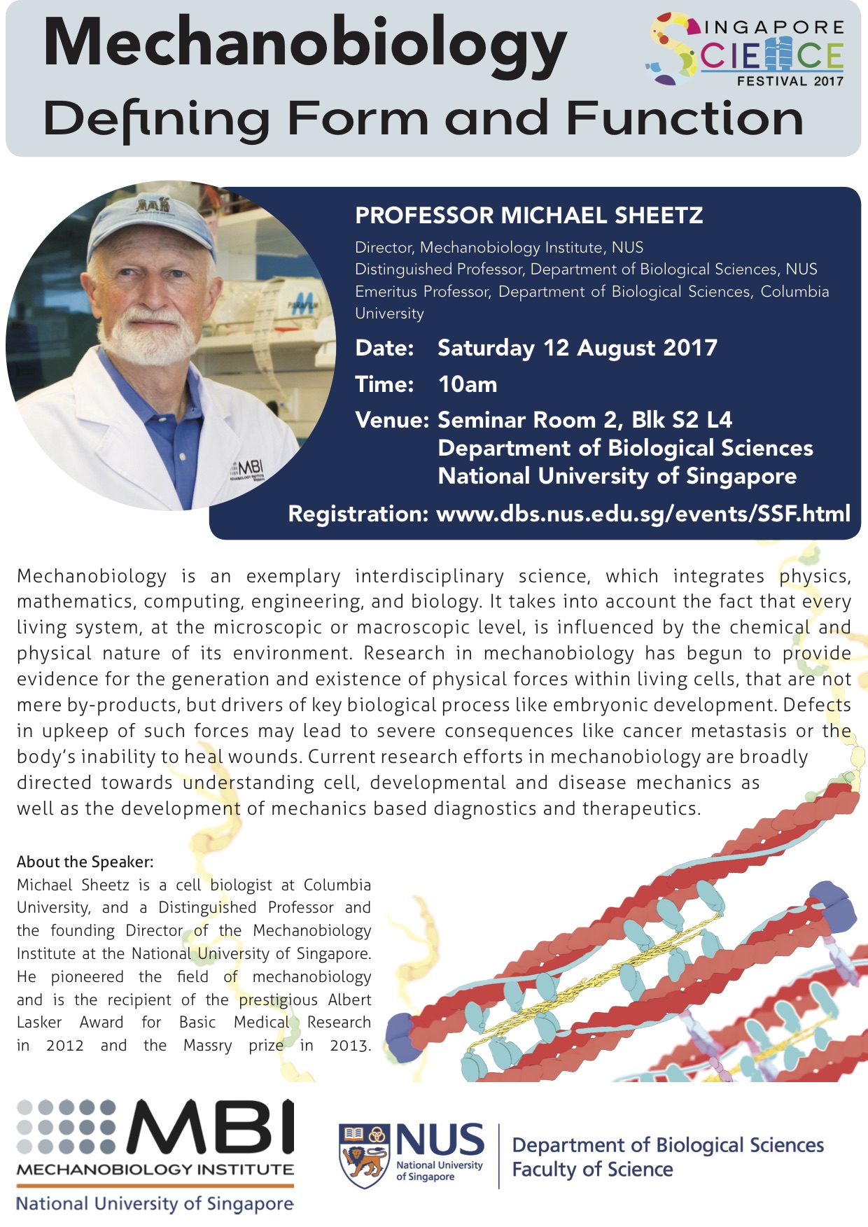 MBI is participating in the Singapore Science Festival with a talk on Mechanobiology from Prof. Michael Sheetz, a pioneer in the emerging field of mechanobiology and the founding Director of the Mechanobiology Institute (MBI), NUS.