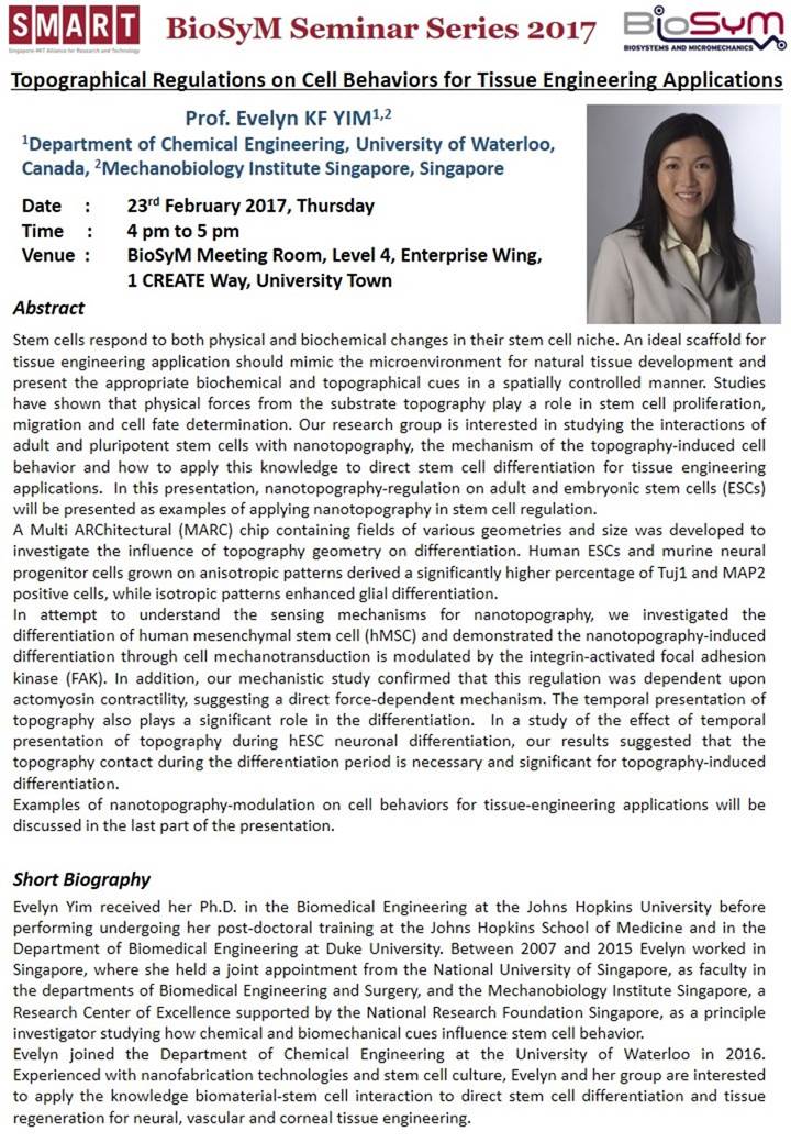 SMART BioSyM Seminar: Topographical Regulations on Cell Behaviors for Tissue Engineering Applications by Prof Evelyn Yim