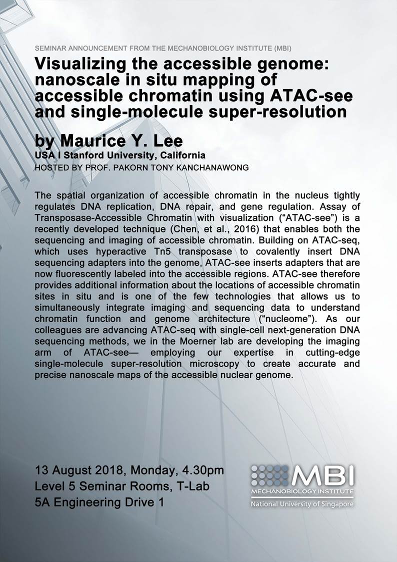 We are pleased to inform you on the seminar of Maurice Y. Lee, hosted by Prof Pakorn Tony Kanchanawong “Visualizing the accessible genome: nanoscale in situ mapping of accessible chromatin using ATAC-see and single-molecule super-resolution fluorescence microscopy” on 13 August (Monday) @ 4.30pm at T-Lab Level 5 Seminar Rooms.