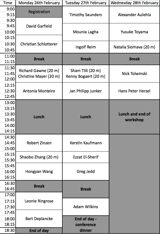 Recently, there has been increasing interest in the importance of temporal regulation during development. How such temporal regulation emerged and how it is controlled at a molecular level are still poorly understood. We aim to bring together a broad range of research interests – from evolution to timing to cell biology – to build potential collaborations to tackle this intriguing problem.