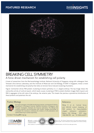 A team of researchers led by Asst. Prof. Fumio Motegi, Principal Investigator at MBI and Temasek Life Sciences Laboratory sought to answer this question by observing the movement of fluorescently labelled PAR protein complexes under the microscope in live C.elegans embryos as they underwent polarization. Using advanced microscopy techniques, they discovered that certain PAR proteins assembled into clusters at the beginning of polarization, and these clusters grew in size as polarization progressed. Once cortical contraction stopped, the clusters disassembled, with the proteins spreading out as a gradient along the front/back axis.