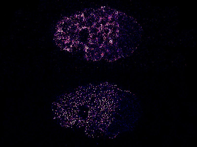 Contraction drives PAR protein clustering to break symmetry in a C. elegans embryo. The top image shows the contractile activity of cortical myosin, which leads causes clustering of PAR-3 protein (bottom image). Both myosin and PAR-3 segregate at the left side of the embryo, the anterior pole. This breaks the previous symmetrical distribution of these proteins and polarizes the cell.
