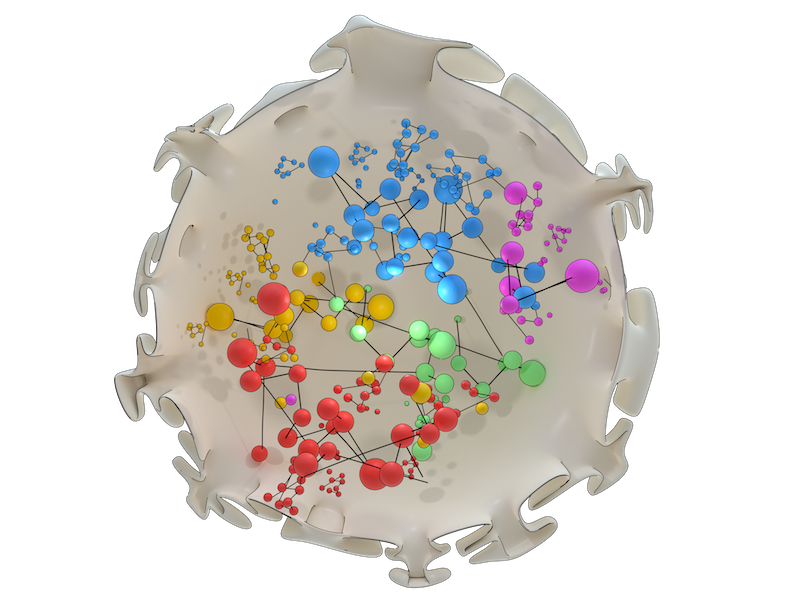 Artistic illustration of chromosome organization within the nucleus as revealed by network analysis. Chromosomes (individually depicted in different colours) are arranged so that intermingling regions and regulatory hot-spots containing molecular machinery overlap, in order to optimize gene expression.