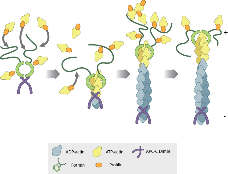 Formins are critical for promoting actin nucleation (initiation of new filaments) and for regulating polymerization (elongation of an existing filament). Formins have a FH1 and FH2 domain, and assemble as homodimers (i.e. two individual formins bind to each other). The dimerized FH2 domains assemble into a ring-like structure, which encircles the barbed end of an actin filament where polymerization occurs. As the filament elongates, it rotates relative to the FH2 ring. The FH1 domains extend from the FH2 ring like a tail, and contain amino acids which have an attraction to profilin, a protein that binds to actin monomers. Therefore, the two FH1 domain of the homodimer are thought to enrich the local concentration of actin monomers in the vicinity of the barbed end, effectively bringing the actin monomers to the building site for actin filament growth.