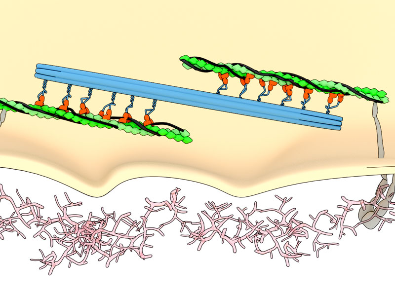 Illustration of rigidity sensing. Contractile force generated by movement of myosin heads (orange; attached to the myosin thick filament (blue)) on actin filaments (green) powers the pinching activity of the transmembrane protein integrin (grey).