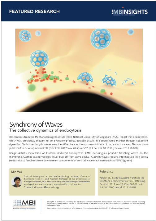 Researchers from the Mechanobiology Institute (MBI), National University of Singapore (NUS), report that endocytosis, which was previously thought to be a random process actually occurs in a coordinated manner through collective dynamics. The work, led by Assistant Professor Wu Min shows how a major endocytic pathway mediated by the protein clathrin, was found to commence with periodic traveling waves of clathrin, which were coupled temporally and spatially to downstream cortical actin waves. Clathrin endocytic waves were identified here as the upstream initiator of cortical actin waves. This work was published in Developmental Cell. Yang et al., Clathrin Assembly Defines the Onset and Geometry of Cortical Patterning.