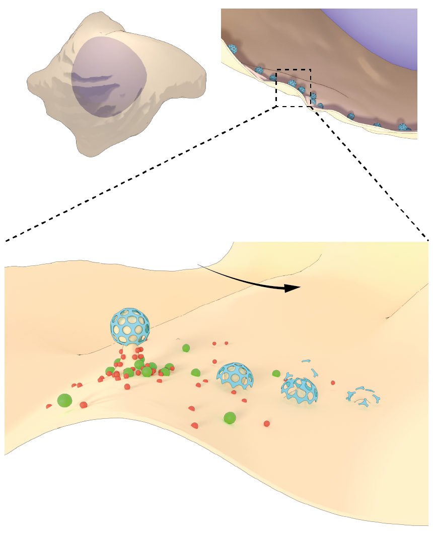 Artist’s impression of Clathrin-Mediated Endocytosis (CME) occuring as periodic traveling waves on the membrane. Clathin coated vesicles (blue) bud off from wave peaks. Clathrin waves require intermediate PIP3 levels (red) and also feedback from downstream components of cortical wave machinery such as FBP17 (green).