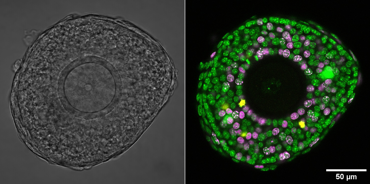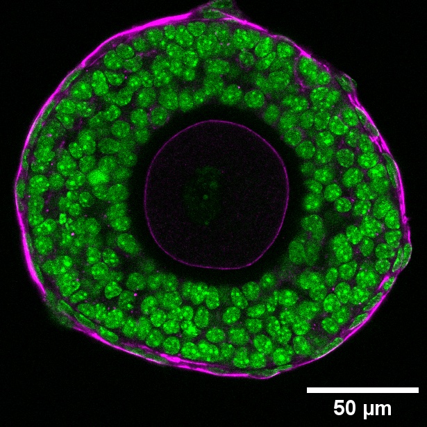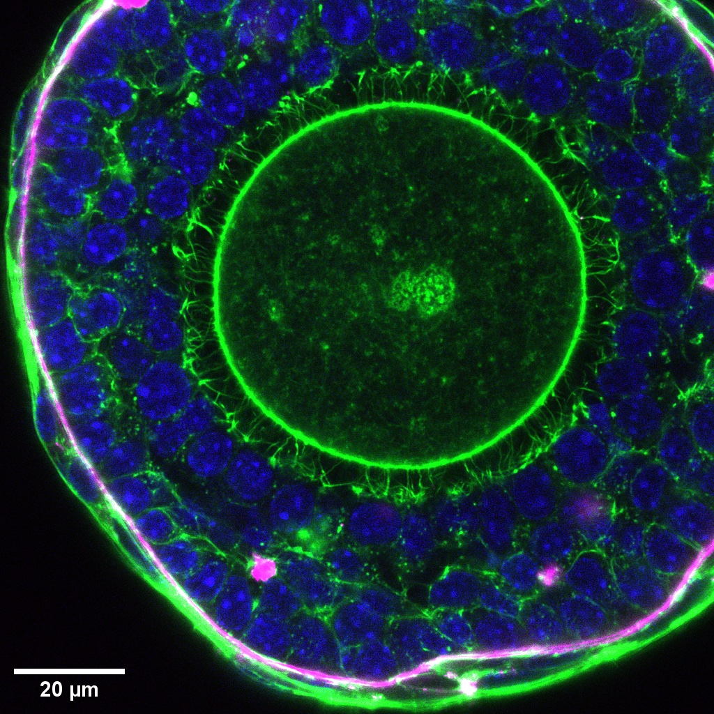 - High resolution image of a secondary follicle showing nucleus (blue), basement membrane (magenta), and actin at cell boundary (green). Transzonal projections can be seen around the oocyte.
